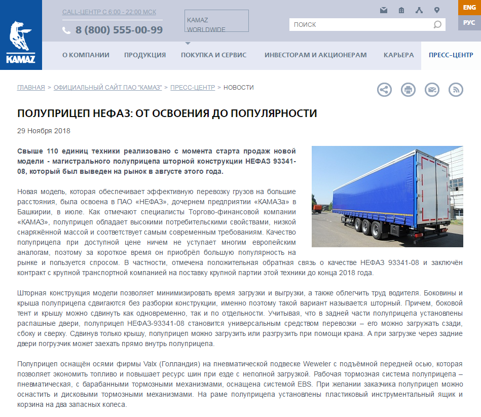 這款新半掛車是今年7月在PJSC NEFAZ生產,PJSC NEFAZ是KAMAZ的子公司。這款半掛車能為貨物提供有效的長距離運輸。按照KAMAZ公司的介紹,這